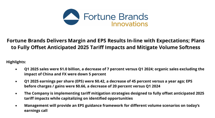 富俊集团首席执行官Nicholas Fink表示:“在第一季度,我们实现了与预期一致的利润率和每股收益。快速变化的地缘政治和宏观经济环境正在影响消费者对我们产品的需求。我们的团队始终展现出迅速应对挑战的能力,并利用这些挑战识别和优先考虑超越市场的机会,我们将再次做到这一点。我们的团队专注于缓解关税的预期影响,进行关键投资,扩展数字业务,并保持强大的资产负债表。我们还计划利用我们在美国和北美强大的制造实力以及数字业务的持续动力,推动市场超越表现。”