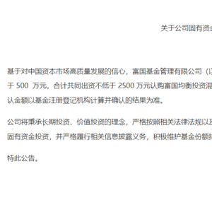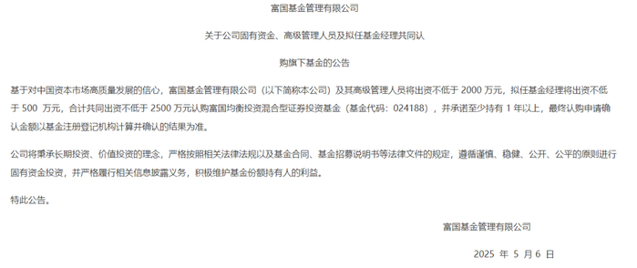5月6日,富国基金公告称,基于对中国资本市场高质量发展的信心,富国基金及其高级管理人员将出资不低于2000万元,拟任基金经理将出资不低于500万元,合计共同出资不低于2500万元认购富国均衡投资混合基金,并承诺至少持有1年以上,最终认购申请确认金额以基金注册登记机构计算并确认的结果为准。