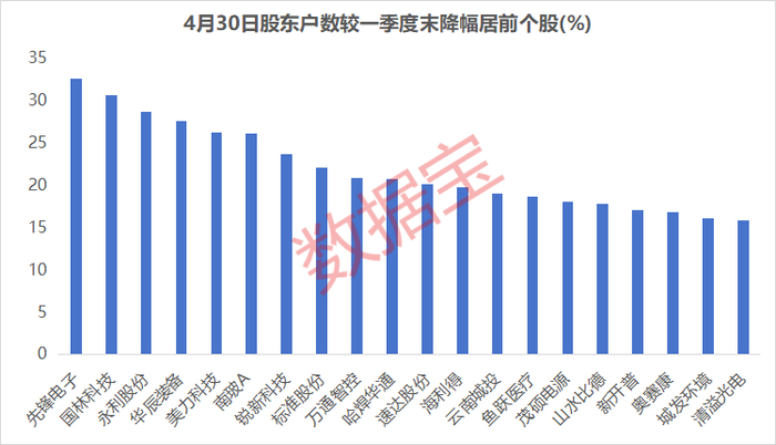 从单只个股来看,先锋电子、国林科技、永利股份股东户数降幅位居前三。先锋电子最新股东户数1.88万户,较3月31日下降32.53%,公司是智能燃气表制造商和系统提供商,2024年净利润增幅接近250%,4月股价小幅下跌0.75%。
