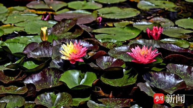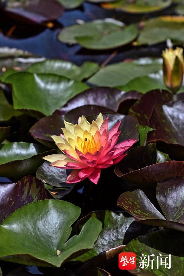 扬子晚报网5月7日讯(记者 徐昇)随着气温上升,南京各景区的睡莲、鸢尾等夏花已经竞相开放。5月7日,莫愁湖北区荷花精品园里一株双色睡莲,吸引了很多游客关注,在荷叶衬托下,盛放的花朵一半金黄、一半玫红,甚是娇艳。