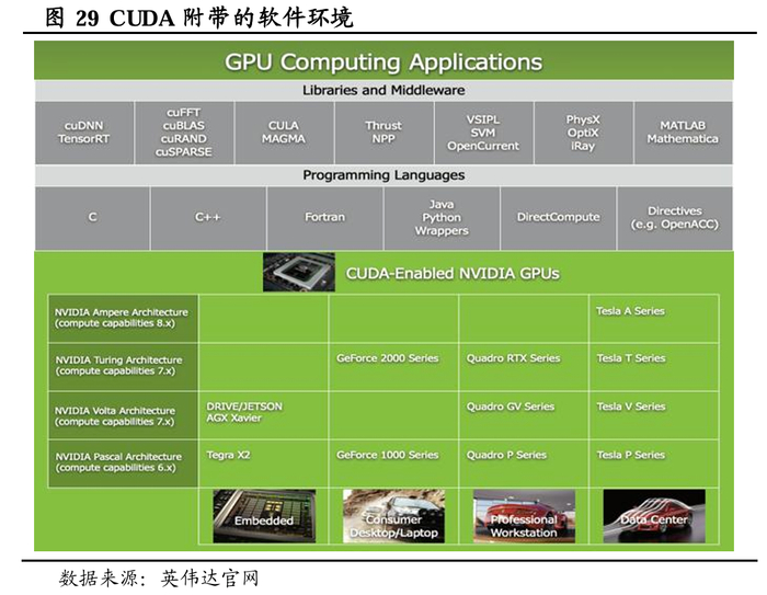 ③构建完整的硬件生态系统:CUDA在英伟达的硬件生态系统中扮演着连接硬件与软件的关键角色。