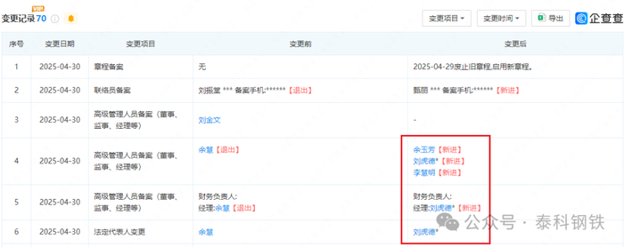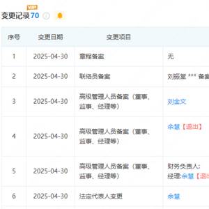 财务负责人、经理余慧(退出),刘虎德担任财务负责人、经理、董事,董事新增李慧明(董事长)、余玉芳(董事);刘金文退出。