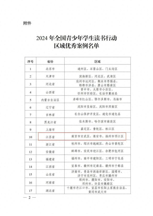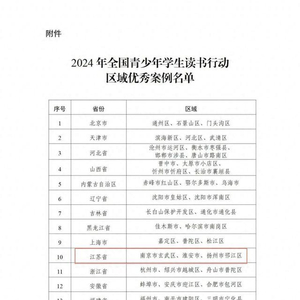 近日,教育部公布2024年全国青少年学生读书行动区域优秀案例名单,经各省级教育行政部门推荐,最终确定98个区域优秀案例。江苏省南京市玄武区、淮安市、扬州市邗江区入选。一起来看——