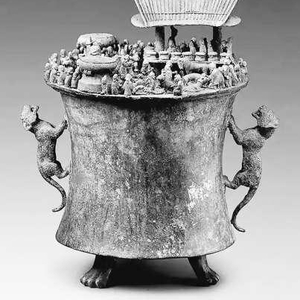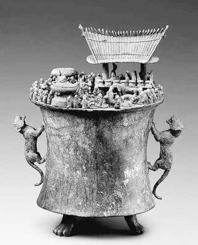 滇国青铜器更进一步,加入写实和生活化元素,以“一器一事”的方式呈现。比如“西汉诅盟场面铜贮贝器”,在直径仅32厘米的贮贝器盖上,焊铸立体人物127人(未计残缺者),精描了滇王杀祭诅盟典礼:吊脚楼下,主祭人坐高台上,身边置多面铜鼓,台下杀牛马豕羊,杂役多人,待刑的裸体男子在主祭身后,旁有多个持器女性……