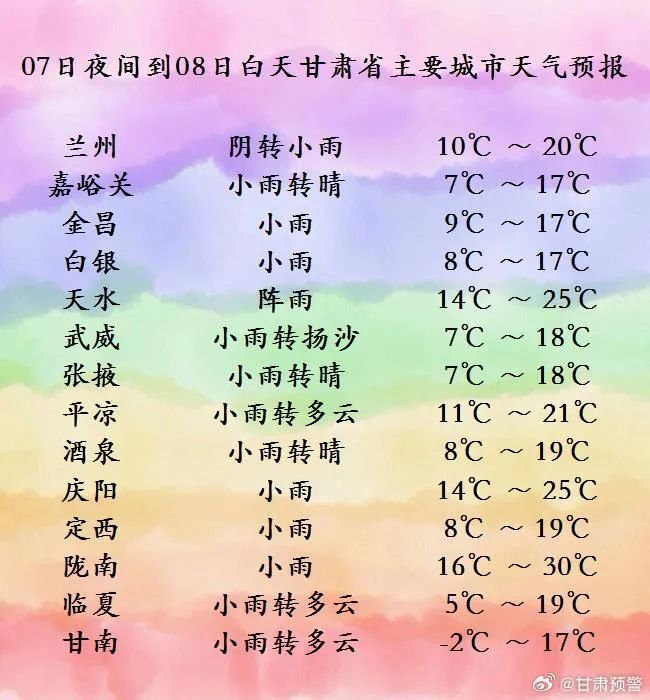 今天夜间到明天白天(5月7日20时—5月8日20时),定西、陇南、天水、平凉等市阴间多云有阵雨或雷阵雨;省内其余地方多云,部分地方阴有阵雨或小雨,祁连山区及甘南高原有雨夹雪。另外,金昌、武威、白银、定西、平凉、庆阳等市有5-6级西北风或偏北风,阵风可达7-9级,酒泉、嘉峪关、张掖、甘南、兰州、天水等市州有4-5级西北风或偏北风,上述地区伴有扬沙或浮尘天气,局部地方有沙尘暴。