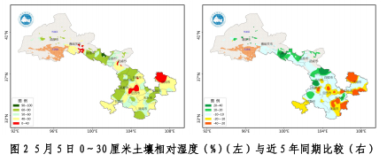 5月5日测墒结果显示,0至30厘米土壤相对湿度,定西市中北部、白银市中南部、庆阳市、平凉市东部、天水市渭北、陇南市北部和甘南州东部在60%以下,其中安定、临洮、环县等地在40%以下,省内其余地方在60%以上。与近5年同期相比,河西大部及景泰、永靖、麦积、合作等地偏高10至30个百分点,定西市东北部、庆阳市西北部和东南部、平凉市东部、陇南市中东部偏低10至35个百分点,省内其余地方接近常年同期。50厘米土壤相对湿度,白银市中南部、定西市北部、庆阳市西北部、天水市渭北、陇南市西北部及临潭、舟曲等地在60%以下,其中安定、临洮、环县等地在40%以下,省内其余地方在60%以上。