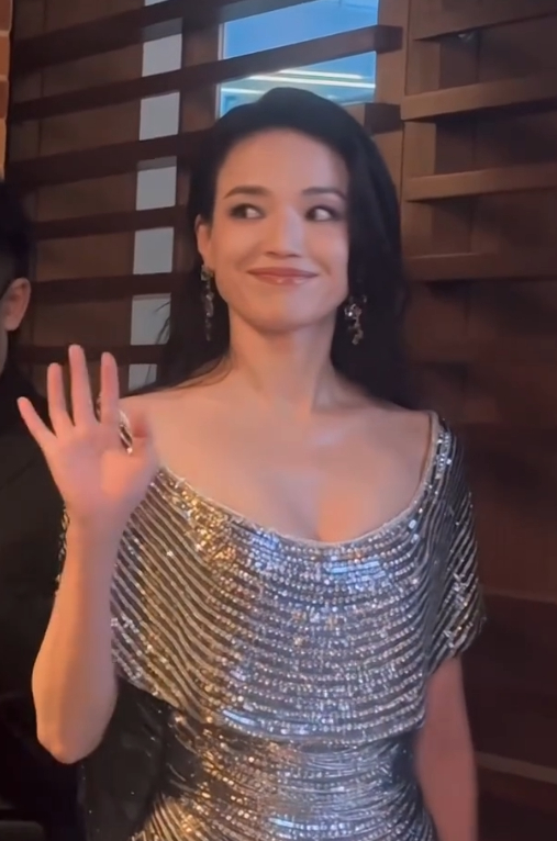 当天晚上,舒淇身穿一件银色亮片水波裙出现,并搭配卷发,十分慵懒随性。