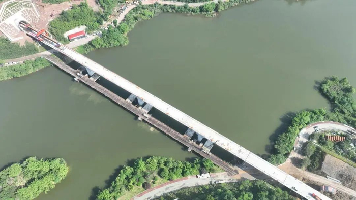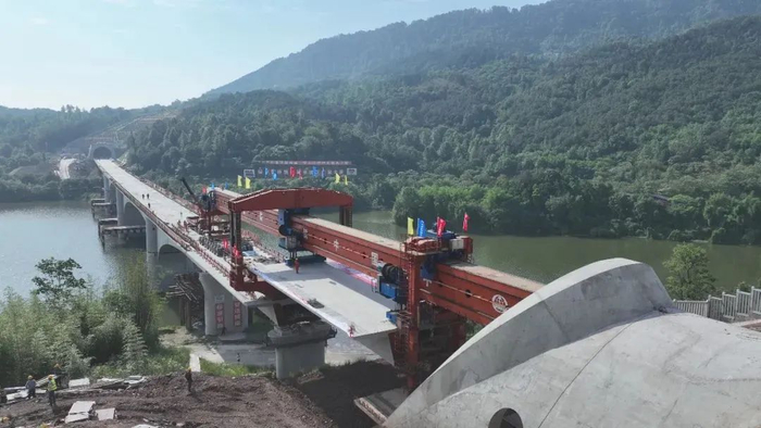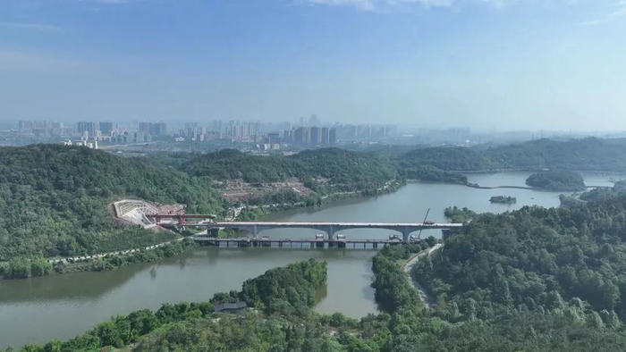 玄天湖大桥作为成渝中线高铁智能化重点(示范)工程,也是全线重难点工程,集成了5项前沿技术和工艺工装。其中,玄天湖双线大桥连续梁全部采用我国新一代智能悬臂造桥机施工,较传统工艺降低高空作业风险50%以上,施工效率提升15%。玄天湖大桥的贯通,为后续无砟轨道施工创造了条件。