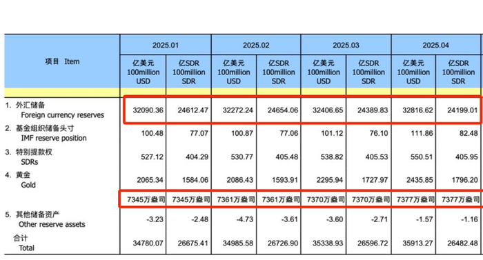 黄金储备方面,央行连续六个月增持黄金。同日,央行公布数据显示,中国4月末黄金储备报7377万盎司,环比增加7万盎司,2025年3月末为7370万盎司。