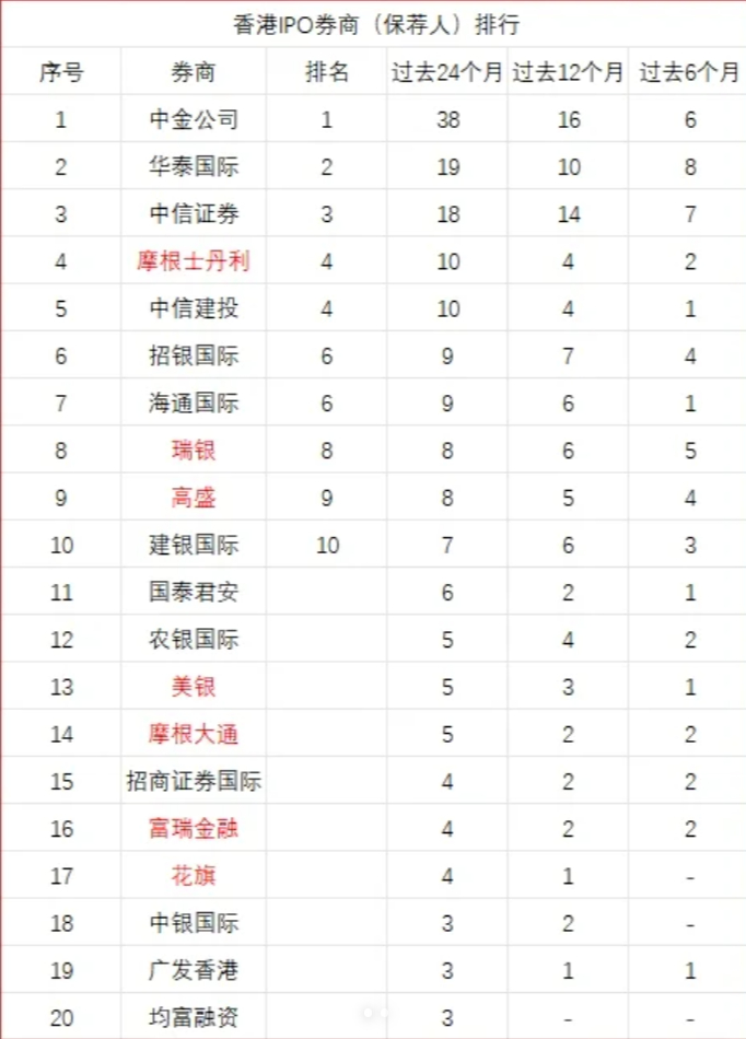 香港券商过去24个月ipo排行榜,中金第一,华泰国际第二,中信第三,这两个差一个。摩根士丹利和中信建投并列第四,10家。招银国际,海通国际并列第六。