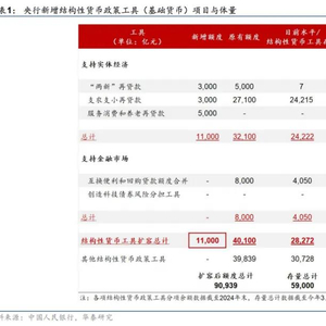 3) 各项结构性金融工具额度扩容总计1.1万亿元,扩张基础货币——如果全部发放,则最多推升货币供应约9-10万亿元、或2.8-3.1%。央行宣布,科技创新和技术改造再贷款、支农支小再贷款、服务消费和养老再贷款分别扩容3,000、3,000、5,000亿元,三项合计扩容1.1万亿元,占现有结构性金融工具总额度(8万亿元)的13.8%。如果全部发放,结合今年3月8.65的货币乘数,有望带动广义货币发行上升9-10万亿元,占M2的2.8%-3.1%。