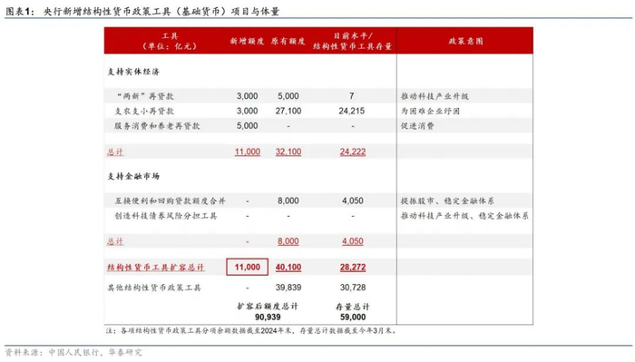 央行推出多项结构型货币政策,支持科技创新、扩大消费、普惠金融等领域。科技创新方面,央行增加3000亿元科技创新和技术改造再贷款额度,并创设科技创新债券风险分担工具。扩大消费方面,设立5000亿元服务消费与养老再贷款。普惠金融方面,增加支小支农再贷款额度3000亿元。此外将优化两项支持资本市场的货币政策工具(互换便利3000亿元+股票回购增持再贷款5000亿元,合并额度后共计8000亿元),助力资本市场发展。