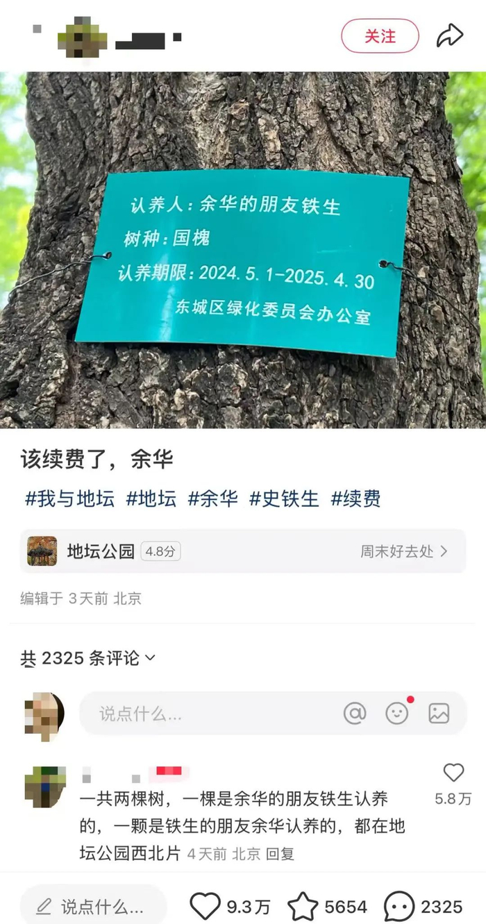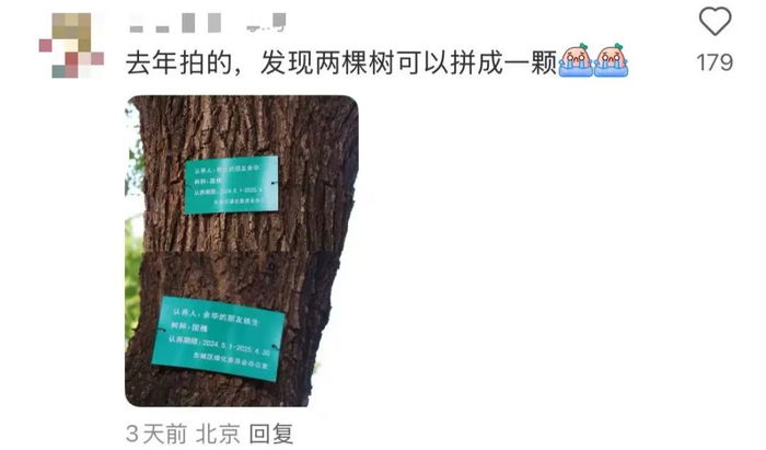 网友发帖显示,两棵国槐树树干上挂着两块牌子,分别写着“认养人:余华的朋友铁生”“认养人:铁生的朋友余华”,认养期限均是从2024年5月1日到2025年4月30日。