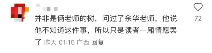 据新京报报道,5月7日上午,记者电话联系了余华询问认养一事,接电话时他表示自己正在看球赛,他告诉记者,这两棵国槐不是自己认养的。“我根本不知道这件事,也没有注意到(上了)热搜。”