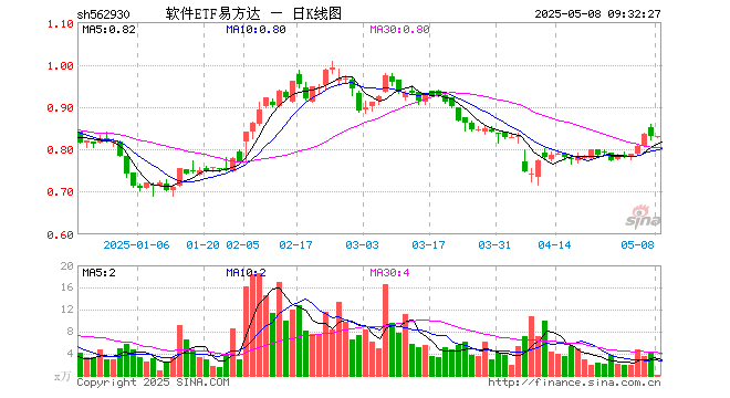 5月8日,软件ETF易方达(562930)开盘跌0.24%,报0.828元。软件ETF易方达(562930)重仓股方面,科大讯飞开盘跌0.42%,金山办公跌0.68%,同花顺跌0.19%,恒生电子跌0.34%,润和软件跌1.22%,三六零涨0.19%,软通动力跌2.03%,用友网络跌0.76%,拓维信息跌1.17%。