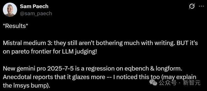 有人测试Medium 3后表示,它的写作能力还是老样子,没啥进步。不过在LLM评测中,它倒是处在帕累托前沿。