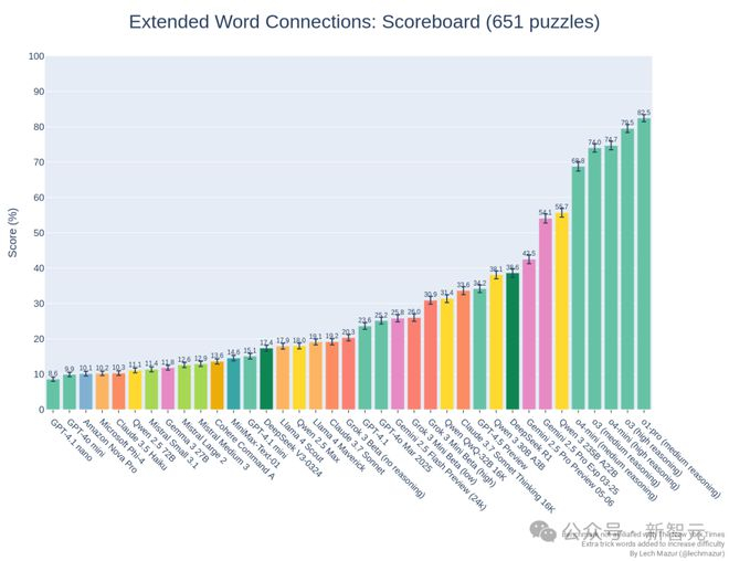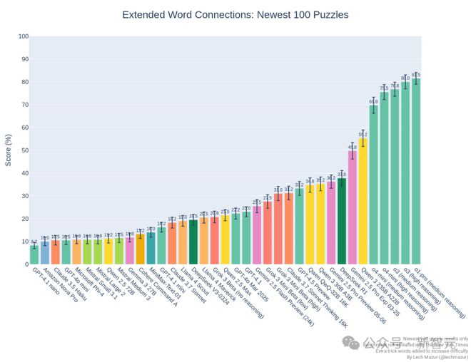 在基于《纽约时报》Connections栏目词汇分类题的评测中,Medium 3处于倒数的位置,几乎找不到它。