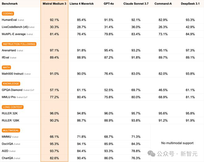从Mistral给出的表中可以看出Mistral Medium 3性能已经基本上超越Llama 4 Maverick和GPT-4o,接近Claude Sonnet 3.7以及DeepSeek 3.1的水平。