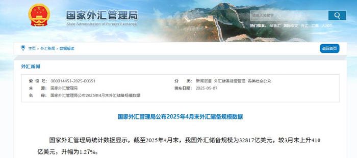 国家外汇管理局统计数据显示,截至2025年4月末,我国外汇储备规模为32817亿美元,较3月末上升410亿美元,升幅为1.27%。