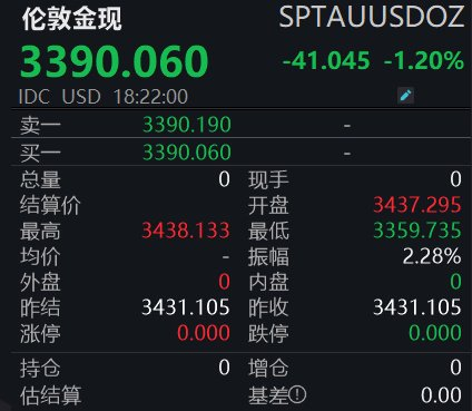 5月7日,伦敦金现盘中最高触及3438.133美元/盎司后转跌,截至记者发稿,最新报价为3390.06美元/盎司,下跌1.2%。