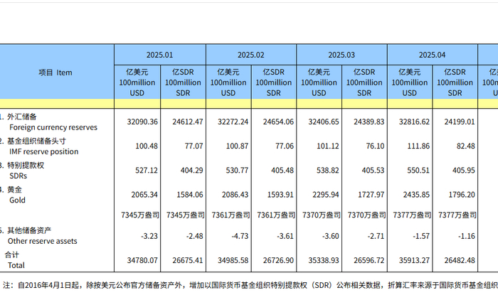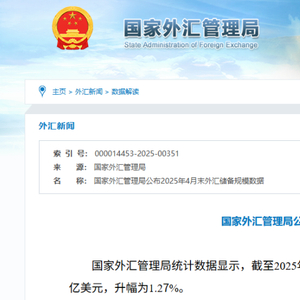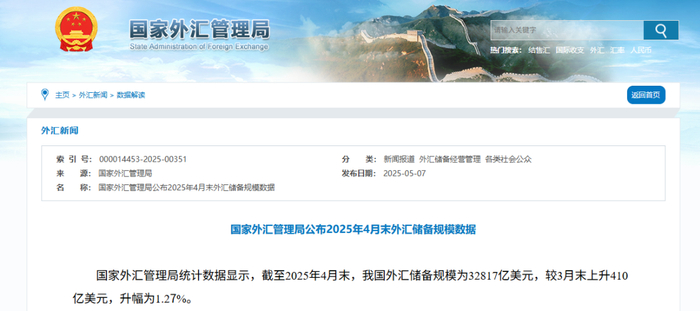 国家外汇管理局统计数据显示,截至2025年4月末,我国外汇储备规模为32817亿美元,较3月末上升410亿美元,升幅为1.27%。