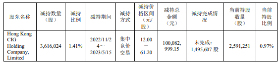 同时,2022年11月24日-2023年5月15日,黄钢实际控制的Hong Kong CIG Holding Company, Limited(以下称“CIG Holding”)减持了剑桥科技3,616,024股,减持金额约为1亿元。
