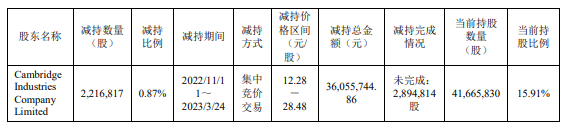 具体来看,2022年11月11日- 2023年3月24日,黄钢全资持有的Cambridge Industries Company Limited(以下称“CIG开曼”)减持了剑桥科技2,216,817股,减持金额约为3605.57万元。
