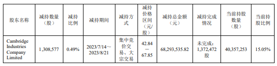 计划抛出后,2023年7月14日-2023年8月21日,CIG开曼减持了剑桥科技1,308,577,共计套现6829.35万元。