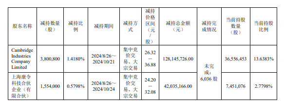 而在中国证监会2023年8月27日出台新政后,康令科技与CIG开曼一样,提前终止了减持计划。直到2024年7月剑桥科技实施完上年度分红后,其于次月的8月26日开始,直至10月24日共减持了1,554,000股,套现了4203.52万元。