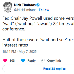 根据有着“新美联储通讯社”之称的著名记者Nick Timiraos的统计,在这场议息会议后的新闻发布会上,一个很有意思的细节是——鲍威尔使用“等待”一词的不同表述(如waiting、await)多达22次,以强调美联储不会急于行动。