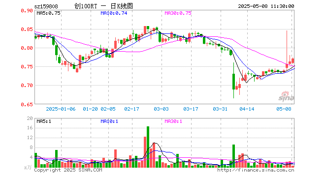 5月8日,截止午间收盘,创100ETF融通(159808)涨1.05%,报0.770元,成交额44.09万元。创100ETF融通(159808)重仓股方面,宁德时代截止午盘涨3.88%,东方财富涨0.24%,汇川技术涨0.18%,迈瑞医疗涨1.32%,阳光电源涨2.85%,温氏股份跌0.24%,中际旭创涨8.60%,新易盛涨10.10%,亿纬锂能涨2.16%,同花顺跌0.37%。