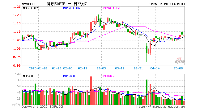 5月8日,截止午间收盘,科创50ETF(588000)跌0.28%,报1.078元,成交额12.37亿元。科创50ETF(588000)重仓股方面,中芯国际截止午盘跌0.83%,海光信息跌2.48%,寒武纪跌1.81%,中微公司涨0.17%,澜起科技跌1.01%,金山办公跌0.06%,联影医疗跌0.94%,传音控股涨2.45%,芯原股份涨0.78%,石头科技涨2.25%。
