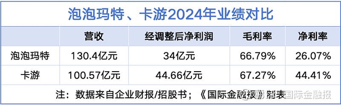2024年,卡游经调整净利润为44.66亿元,净利率高达44.41%;而泡泡玛特营收为130.4亿元,经调整净利润为34亿元,净利率为26%。