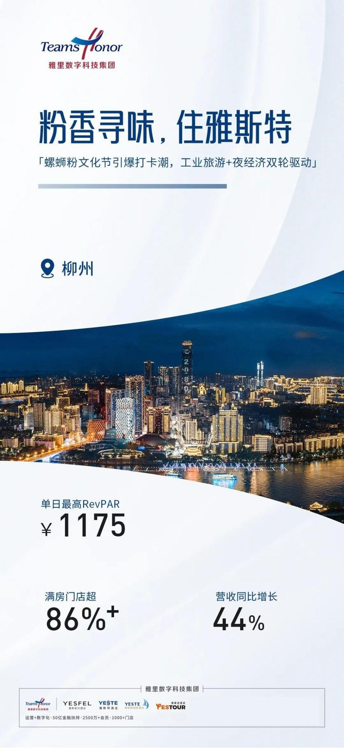 从各品牌表现来说,雅斯特品牌成为年轻客群首选,满房超530次,单日最高ADR超1300元,综合ADR同比增长35.4%;雅斯菲尔则成为中高端市场领跑者,单日最高ADR超1600元,综合ADR同比增长33.5%。各维度数据均展现出雅里数科强劲的市场竞争力和行业影响力。