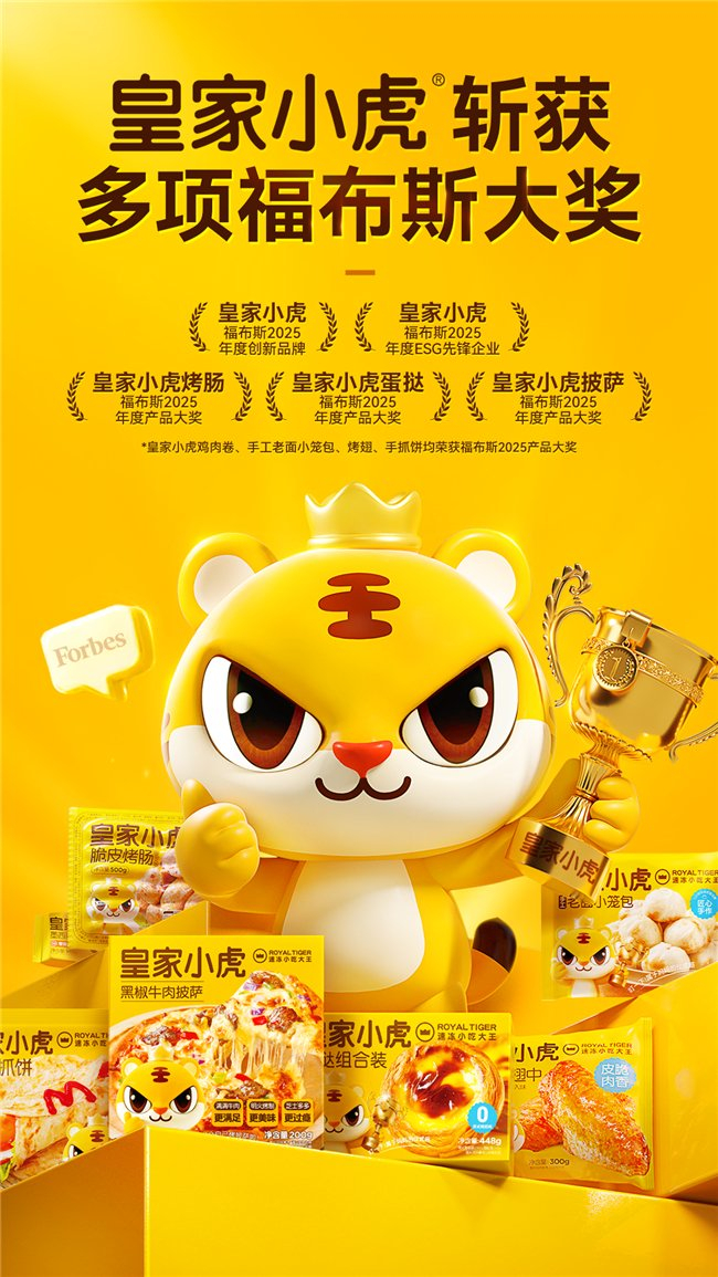 作为速冻食品全网销量第一品牌,皇家小虎速冻小吃大王致力于为中国大众消费者提供高品质的速冻食品,现已形成“肉制品系列”、“烘焙系列”、“面点系列”、“调味品系列”四大产品系列。截至2025年4月,皇家小虎取得了烤肠连续三年全国销量第一、蛋挞连续三年全球销量第一的成绩,还荣获“2025年福布斯品牌大奖”、“福布斯ESG先锋企业”等多项大奖。