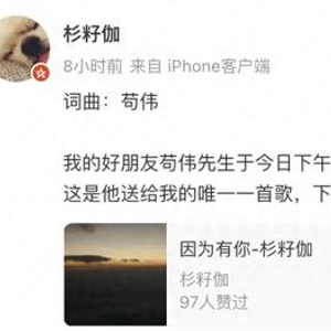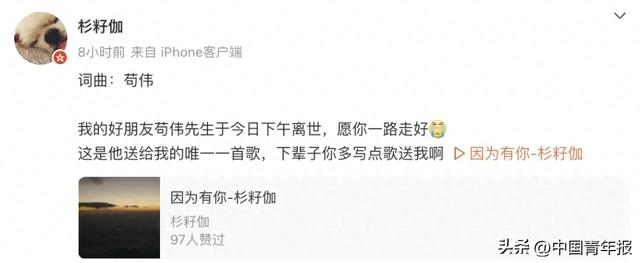 5月7日凌晨,成都歌手杉籽伽发文,称“我的好朋友苟伟先生于今日(6日)下午离世,愿你一路走好”。