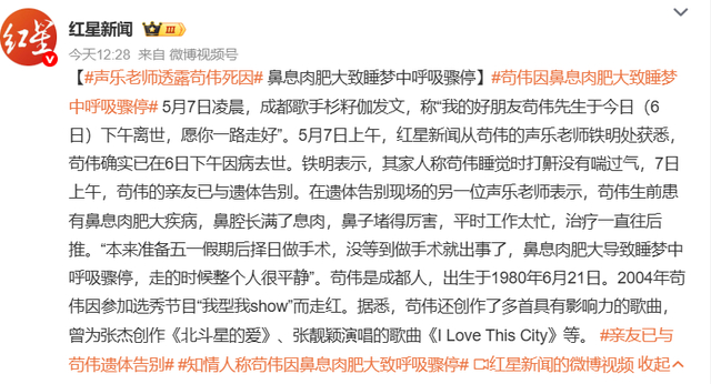5月7日上午,红星新闻记者从苟伟的声乐老师铁明处获悉,苟伟确实已在6日下午因窒息去世。铁明表示,其家人称苟伟睡觉时打鼾没有喘过气,5月7日上午,苟伟的亲友已与遗体告别,苟伟生前众多好友到成都市殡仪馆送别。