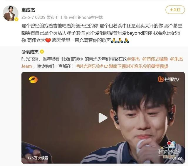 歌手袁成杰发文称:“那个曾经的抱着吉他唱着《海阔天空》的你,那个包着头巾还是满头大汗的你,那个总是嘲笑着自己是个灵活大胖子的你,那个爱唱歌爱音乐爱beyond的你,我会永远记得你,苟伟老大。”