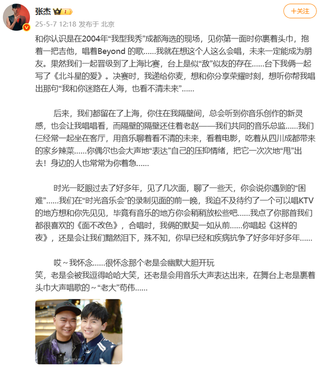 和你认识是在2004年“我型我秀”成都海选的现场,见你第一面时你裹着头巾,抱着一把吉他,唱着Beyond的歌……我就在想这个人这么会唱,未来一定能成为朋友。果然我们一起晋级到了上海比赛,台上是似“敌”似友的存在……台下我俩一起写了《北斗星的爱》。决赛时,我递给你麦,想和你分享荣耀时刻,想听你帮我唱出那句“我和你迷路在人海,也看不清未来”……