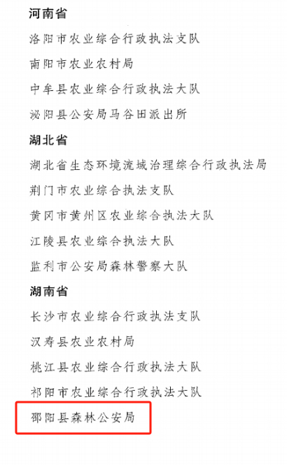 近日,农业农村部、公安部、中国海警局联合发布《关于对2024年渔业执法系列专项行动工作突出的集体和个人给予表扬的通报》,对全国范围内在“中国渔政亮剑2024”专项行动中表现突出的集体和个人予以通报表扬。邵阳县农业综合行政执法大队及该大队执法人员肖调乐光荣上榜,分别获评“2024年渔业执法系列专项行动工作突出集体”和“突出个人”。