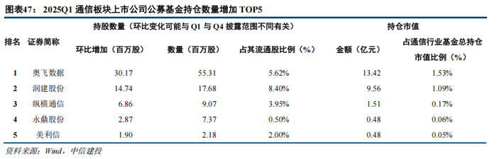 环比2024Q4,2025Q1通信行业公募基金持仓股份数量增加前五依次为奥飞数据、润建股份、纵横通信、永鼎股份、美利信,2025Q1通信行业公募基金持仓股份数量减少前五依次为中国电信、中国联通、中兴通讯、亨通光电、中天科技。(特别说明:持股数量变化仅供参考,不同季度披露数据范围可能不同。)