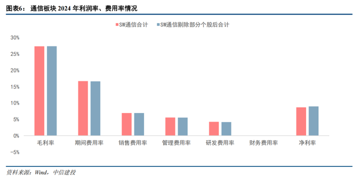 通信板块2024年盈利能力小幅提升。2024年,通信板块综合毛利率为27.31%,同比下降0.10pct;期间费用率为16.68%,同比下降0.46pct,其中销售费用率、管理费用率、研发费用率分别同比下降0.22pct、0.15pct、0.17pct,财务费用率同比提升0.08pct;净利率8.66%,同比提升0.22pct。