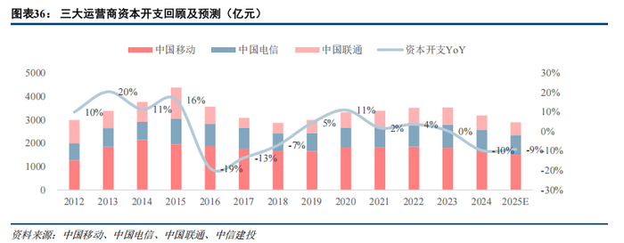 运营商资本开支现下降拐点,有利于现金流改善。2024年三大电信运营商实际资本开支均低于计划值:中国移动年初计划资本开支1730亿元,实际1640亿元;中国电信年初计划资本开支960亿元,实际935亿元;中国联通年初计划资本开支650亿元,实际614亿元。2025年,中国移动计划资本开支1512亿元,同比下降7.8%;中国电信计划资本开支836亿元,同比下降10.6%;中国联通计划投资550亿元,同比下降10.4%。我们认为,6G商用预计在2030年前后,AI投资总体规模可控,预计运营商资本开支未来几年可能持续下降。