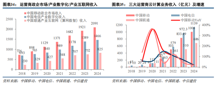 2024年,中国移动政企市场实现收入2090.78亿元,同比增长8.8%;中国电信实现产业数字化收入1465.88亿元,同比增长5.5%;中国联通算网数智实现收入825亿元,同比增长9.6%(一般政企市场收入大于DICT/产业数字化/产业互联网业务收入)。云计算方面,2024年三大运营商云业务维持较高增速,中国电信、中国移动收入均破千亿元。中国移动移动云收入1004亿元,同比增长20.4%;中国电信天翼云收入1139亿元,同比增长17.1%;中国联通联通云实现收入686亿元(口径调整),同比增长17.1%。总体来看,运营商政企市场收入增速相对更快,是主要的收入增长点,但近两年也受宏观影响,出现应收账款增加,影响现金流和利润情况。