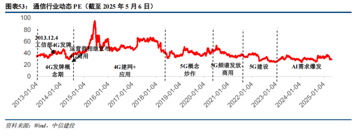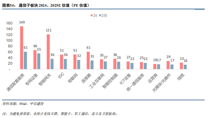 基于各公司2025年盈利的Wind一致预测来计算板块估值,没有一致预期的,若2024年利润为正则假设与2024年持平,否则假设与2023年持平(2023年归母净利润为正时)。整体来看,2025年预期估值较低的板块是:线缆(16X)、光模块/光器件(17X)、运营商(17X),较高的板块是:通信配套服务(61X)、专网设备(55X)、智能网关(36X)。