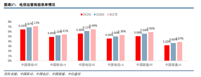 三大运营商派息率持续提升,股息回报良好。按当前股价测算,预计2025年中国移动、中国电信、中国联通H股股息率为6.4%、5.6%、5.1%;A股股息率为4.9%、4.6%、3.2%,股息回报良好。