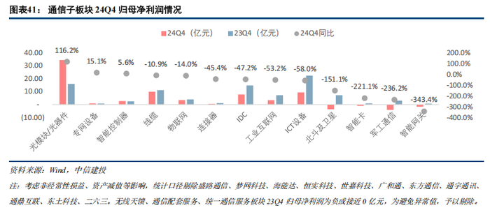 2024Q4归母净利润同比增速表现前三的板块为:光器件/光模块(34.25亿元,同比增长116.2%),专网设备(0.90亿元,同比增长15.1%),智能控制器(2.66亿元,同比增长5.6%)。2024Q4归母净利润同比增速后三位依次是:智能网关(-1.73亿元,同比下降343.4%),军工通信(-4.16亿元,同比下降236.2%),智能卡(-1.73亿元,同比下降221.1%)。
