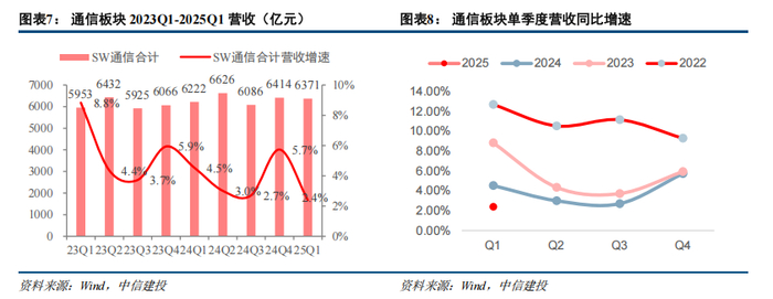 通信板块2024Q4营收合计6414亿元,同比增长5.7%;2025Q1营收合计6371亿元,同比增长2.4%。总体来看,通信板块近几年单季度的收入同比增速不断下台阶。