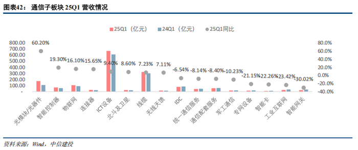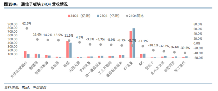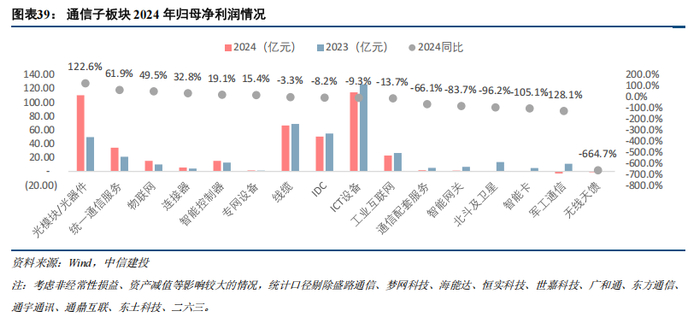 根据中信建投通信团队对于通信行业各子板块的划分,通信各子板块中,2024年营收同比增速前三位依次是:光模块/光器件(578.23亿元,同比增长69.1%),连接器(113.74亿元,同比增长28.5%),物联网(416.94亿元,同比增长24.4%)。2024年营收同比增速后三位依次是:北斗及卫星(120.87亿元,同比下降25.4%)、智能卡(52.01亿元,同比下降24.8%)、军工通信(95.17亿元,同比下降23.0%)。