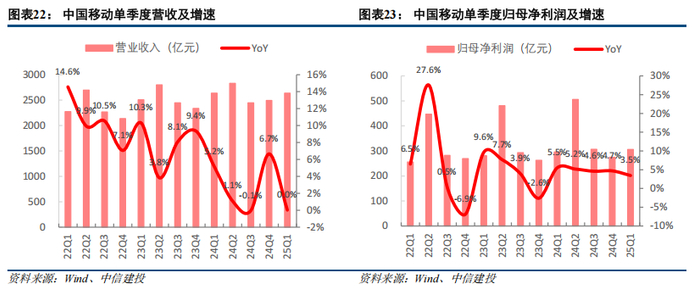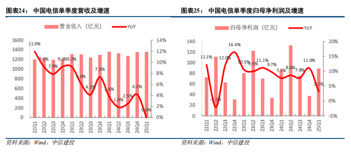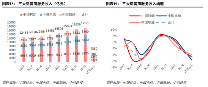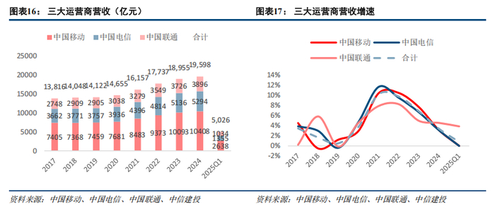 2024年,三大运营商(港股)收入同比增长3.4%,归母净利润同比增长6.1%,2025Q1收入和净利润增速降至0.8%和3.7%。